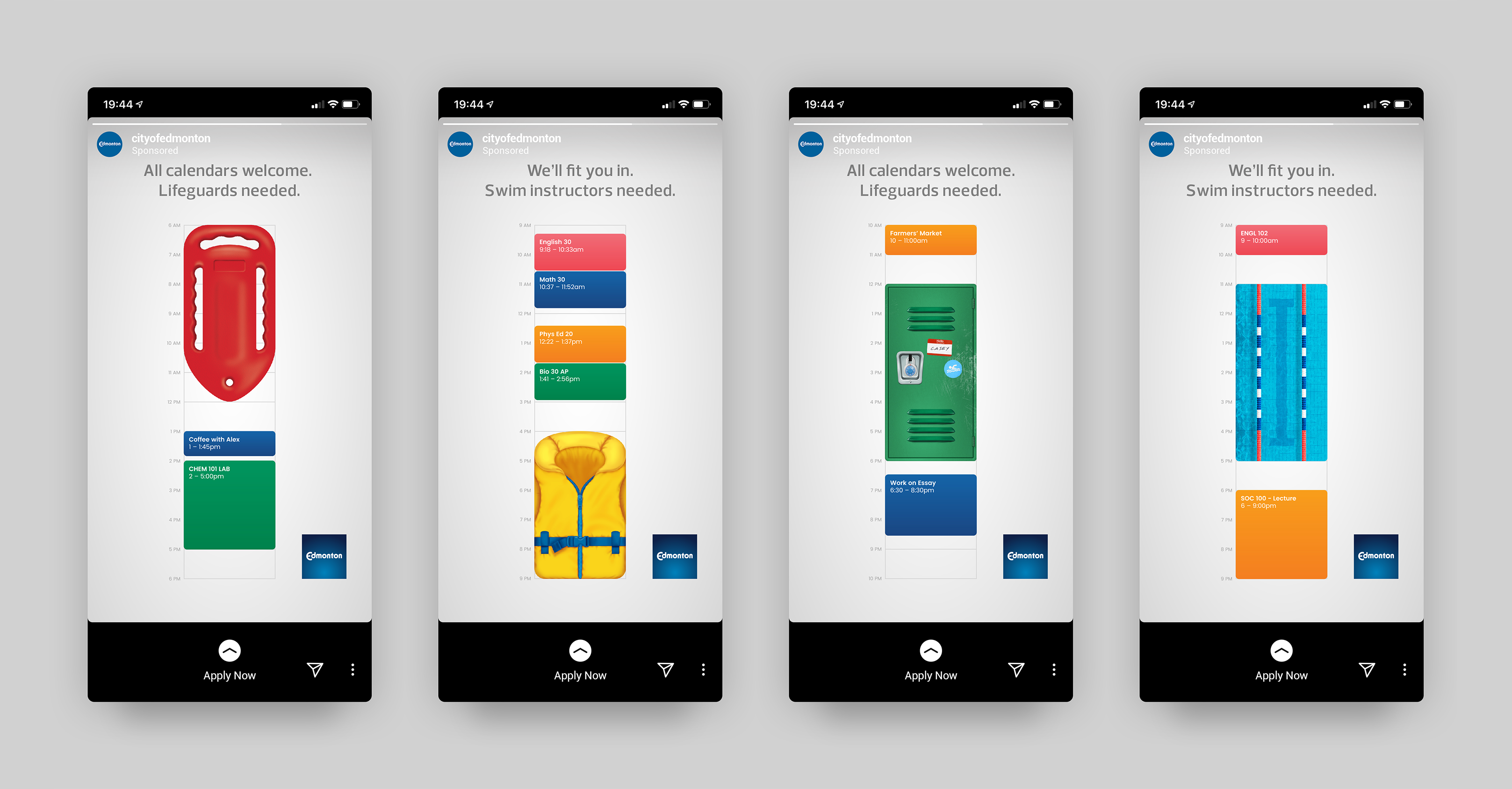 As families began making their way back to Edmonton’s recreation centres, our client needed to replenish their aquatics department after scaling it back due to the pandemic. The challenge was to reach students, as they are the ideal job candidate, and to position recreation centres as an ideal job opportunity for students. We were fortunate to have cost-free access to internal advertising real estate within recreation centres across the city. We displayed several concept variations, digitally and non-digitally, throughout these centers as they are also likely destinations for students to exercise and socialize. Using the familiar sight of a google calendar we depicted the flexibility these jobs offered, appealing to the hectic and unpredictable student schedule.