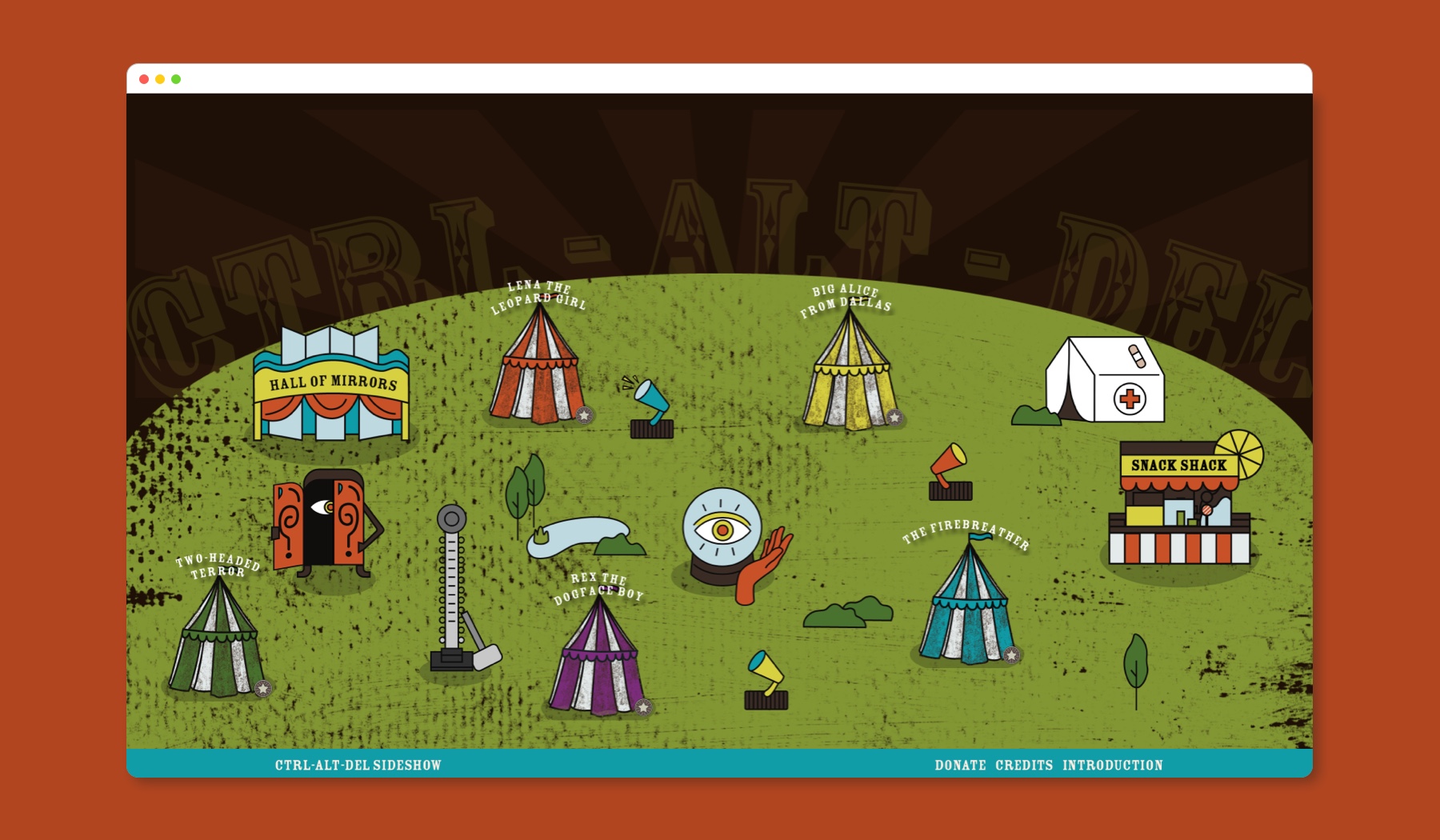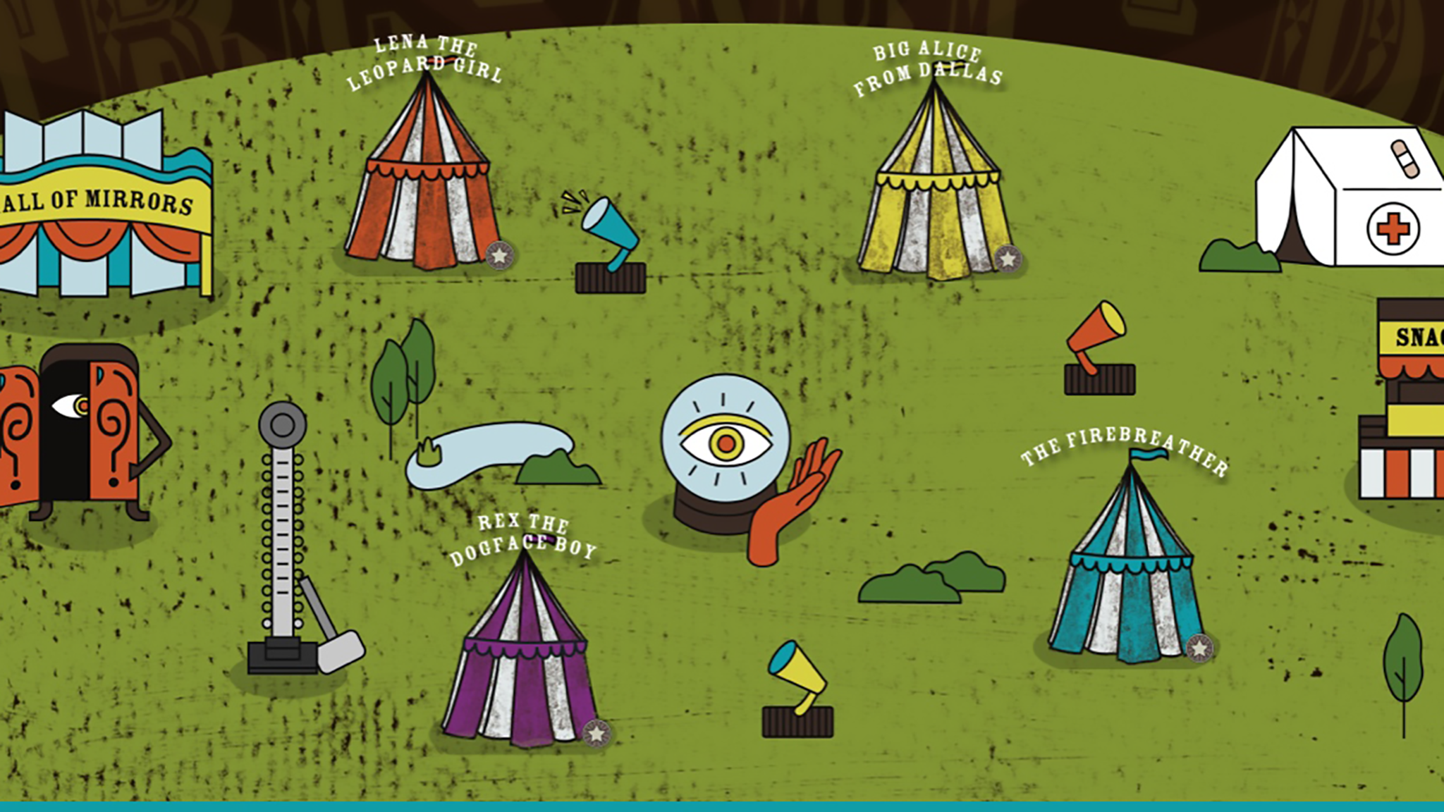 CTRL-ALT-DEL is a video series from Concrete Theatre that explores the harmful aspects of the internet for a young, teen audience told through a circus sideshow theme. Concrete Theatre was looking for a way to organize their videos in an interactive map experience where the different videos would make up a “fairground”, with tents, a fortune teller, cabinet of curiosity, etc, and each video could be watched in any order. We created an illustration style that balances the sideshow theme with the serious subject matter, and developed a website where videos play when each illustrated piece is clicked on. Small touches of animation throughout also bring the illustrations to life and invite visitors of the site to engage and explore.