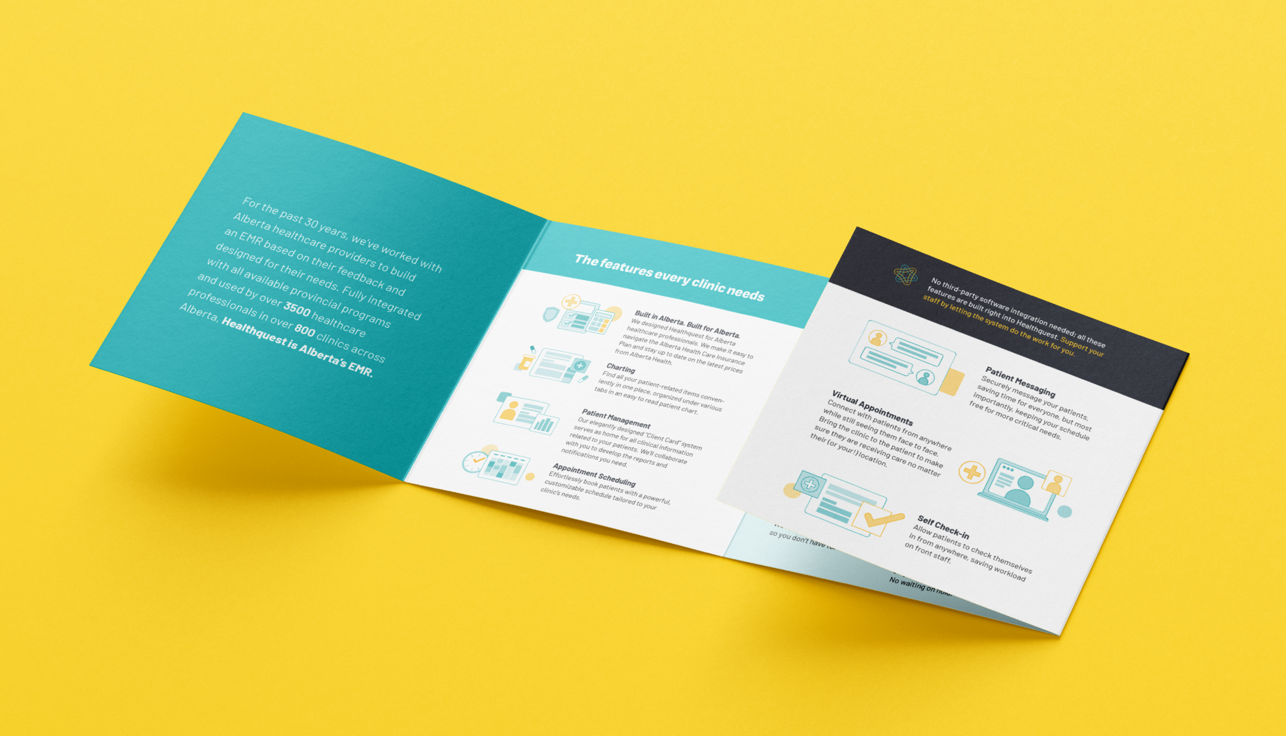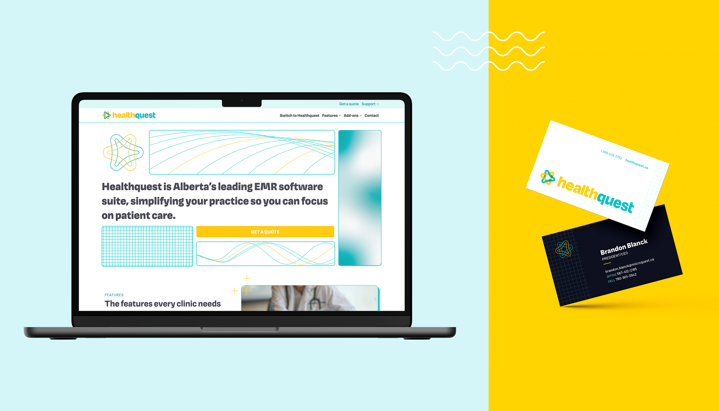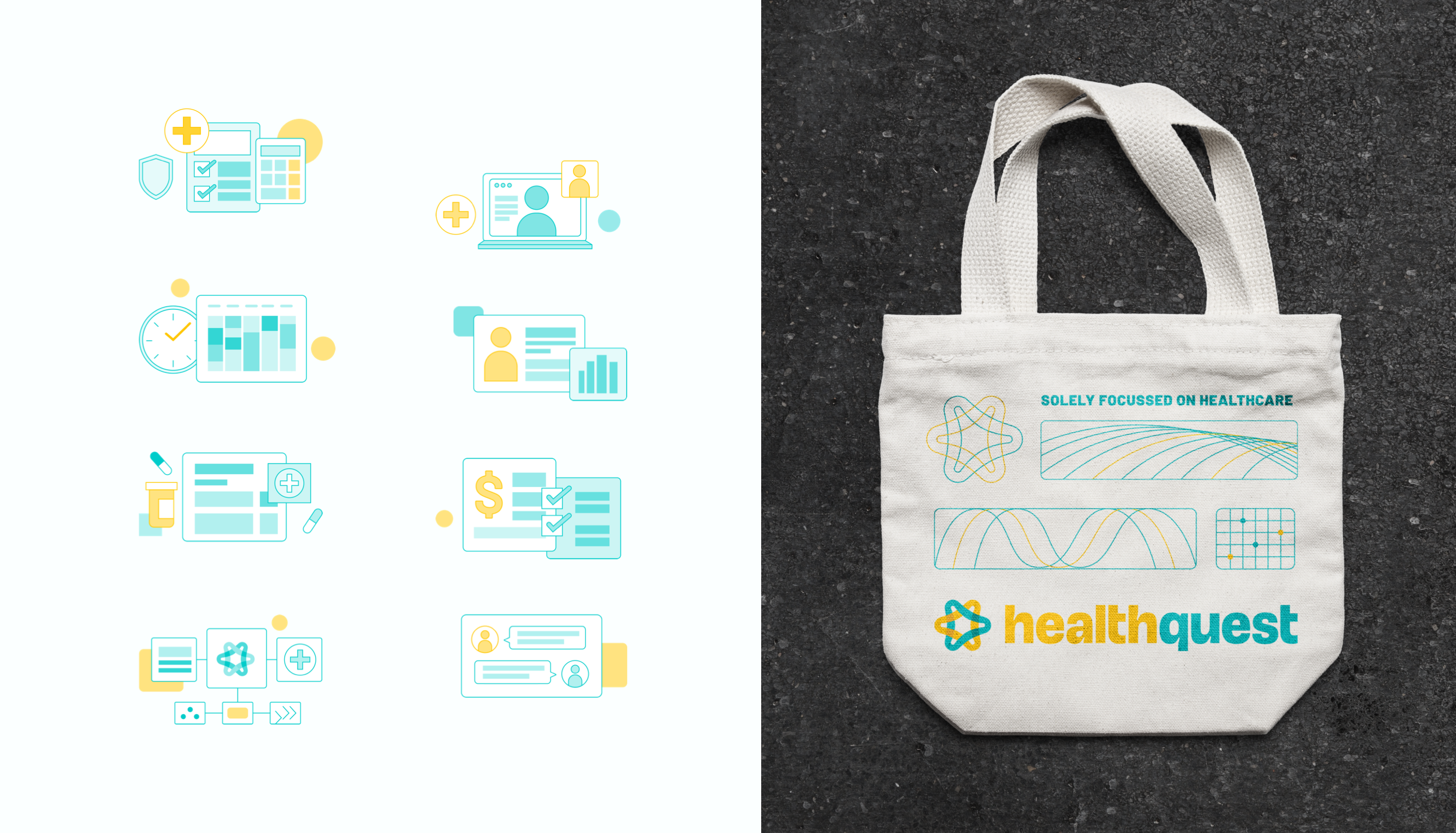 Next, we created a visual identity system that paired the vibrant colours of the logo with illustrative elements of digital & analog documentation, data visualization, grids, and charts. A look familiar to Healthquest’s audience of patients and healthcare professionals, this new identity balances dependability with a playful, contemporary style.