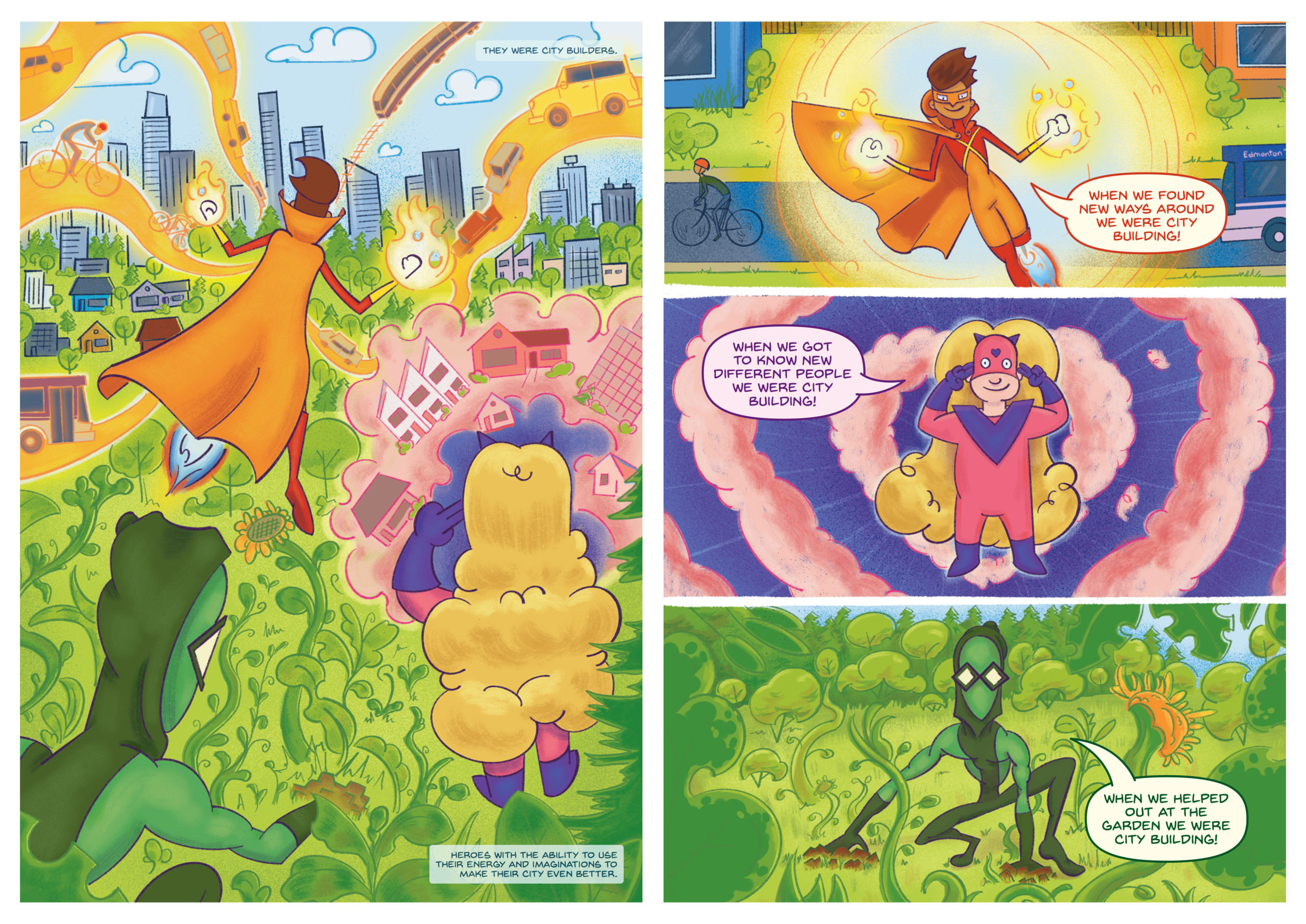 Kids have unique perspectives on what does and doesn’t work about a city. To gather these ideas, the City of Edmonton had launched a series of workshops in schools to talk to kids about how their city works. One of these exercises had kids imagining super heroes with the power to make their city better. To show kids across the city that city building is a super power and to thank them for their participation, we created a custom written and illustrated comic book based on their superhero designs. We took their illustrations and character descriptions (included in the final product), their favourite parts of the city, and their big ideas for the future, and let those ideas inspire a comic book (distributed and read in schools) about how everyone who builds our city is a superhero.