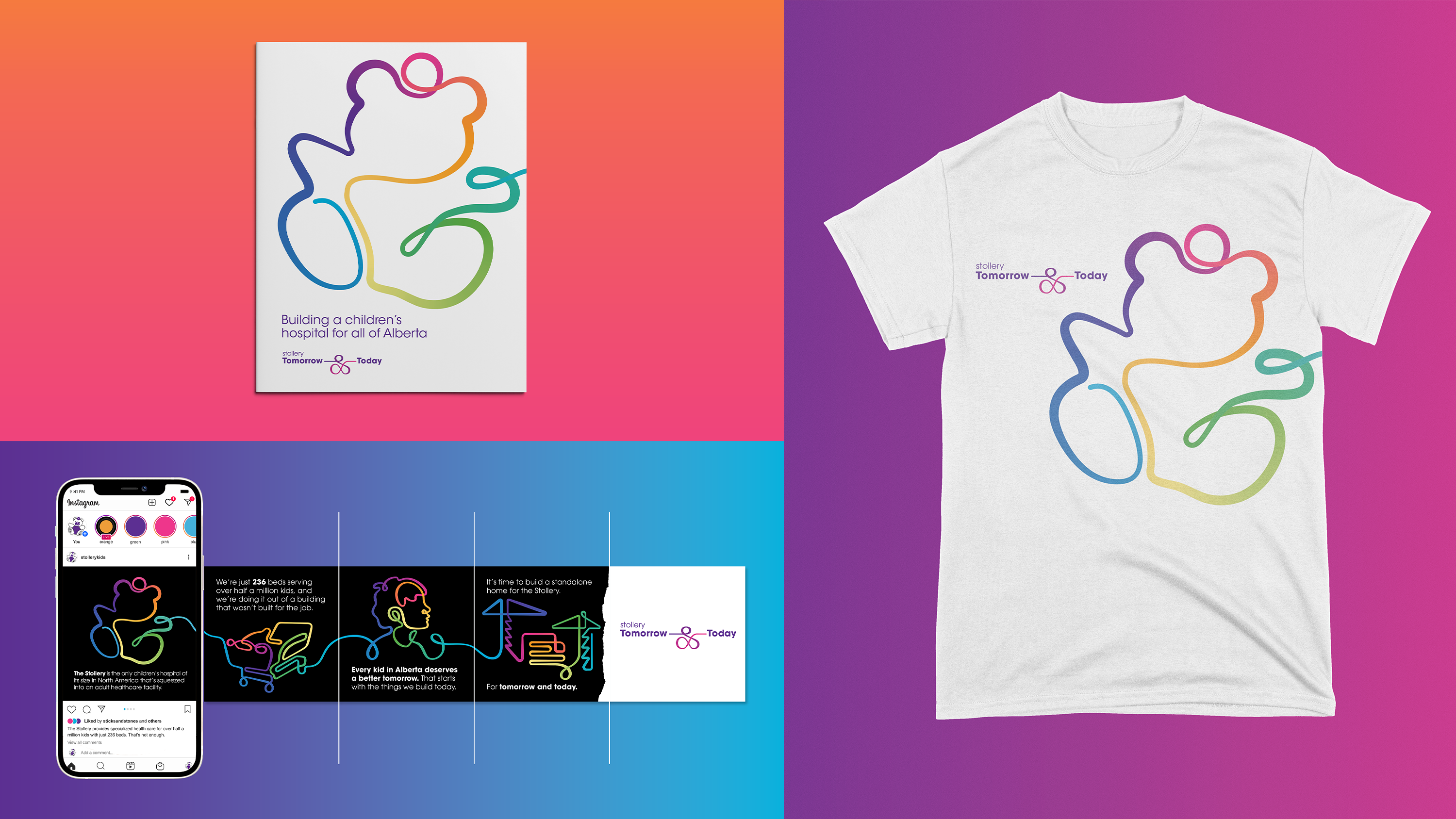 The identity system for the Stollery Children’s Hospital Foundation’s ‘Tomorrow & Today’ Campaign visualizes the journey of Stollery’s past, present, and future. A campaign centred around advocating for a standalone children’s hospital in Northern Alberta, the identity system draws out the picture of Stollery’s current challenges and envisions what a better tomorrow could look like. The journey may be full of ups and downs, twists and turns, but the outcome is for every child in Alberta to have a better tomorrow, starting with the things we build today. A gradient connected line became the visual language for the identity system being used for the campaign logo, illustrations, and visual messaging. The line is infinite and can be extended to contain and describe Stollery’s history and vision for the future.